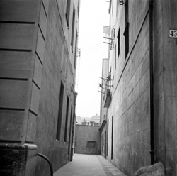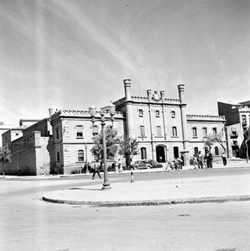 "Plaça de Cervantes i Rambla d’Aragó; ruïnes del Palau dels Marquesos de la Tallada, antic Palau Episcopal; al fons la Plaça i església de Sant Llorenç; a l’esquerra Carrer de la Cotxera"
