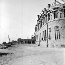 "Urbanització de la nova Avinguda de Madrid; a la dreta la Gota de Llet, Dispensari Municipal i Casa de Socorro, antigament també va fer funcions de laboratori municipal"