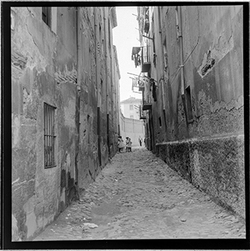 "Des del Carrer Cavallers, inici del Carrer de la Galera; al fons, a l'esquerra, la baixada del Carrer Alsamora; una dona i un nen enmig del carrer"
