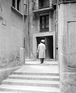"Carrer de Nolius; a la part alta, hi ha un rètol indicant la BIBLIOTECA PUBLICA, de Caixa de Pensions per a la Vellesa i d’Estalvis (La Caixa)"