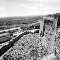 "Castell dels templers de Santa Maria de Gardeny; vista cap al sud-est; vessant del turó i muralles; al fons la zona esportiva (Camp Escolar), l’Institut de Batxillerat Màrius Torres i el riu Segre"