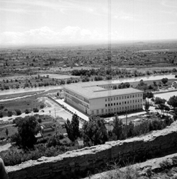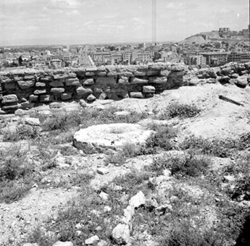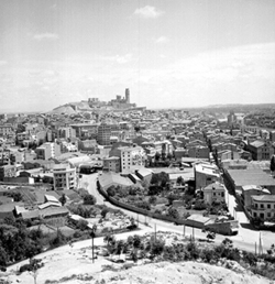 "Castell dels templers de Santa Maria de Gardeny; vista cap al nord-est; vessant del turó i sector del Carrer Alcalde Costa, xamfrà amb l'actual Passeig de Ronda i el Carrer Isaac Albéniz (Plaça de l'Exèrcit) i Acadèmia; al fons el turó de la Seu Vella"