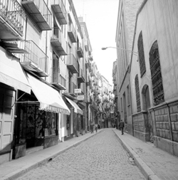 "Carrer de Sant Antoni; a la dreta l'església dels Mercedaris\nGéneros de punto; barberia Tomás; Sastre"