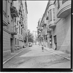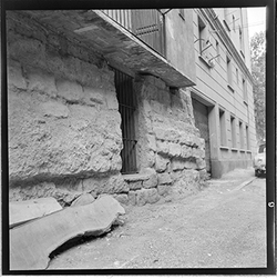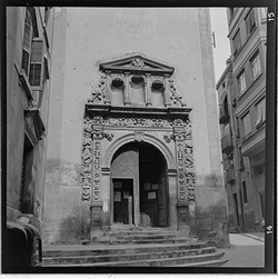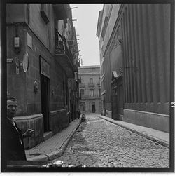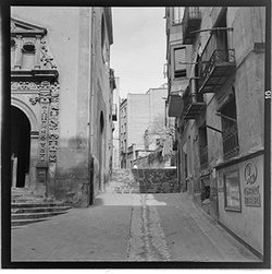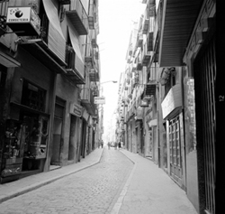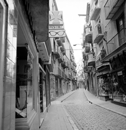 "El Carrer Germanetes del Pobres des del Carrer de Sant Antoni; a l'esquerra l'església de la Sang\nComercial fotográfica"