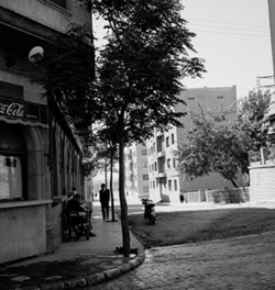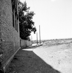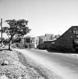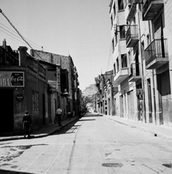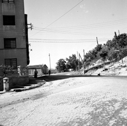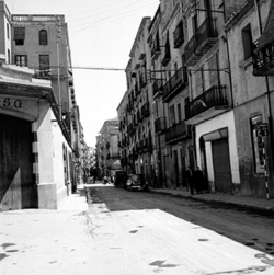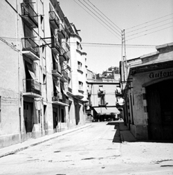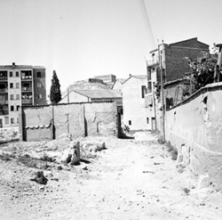 "Final del Carrer Alcalde Costa, xamfrà amb el Carrer Isaac Albéniz; al fons els blocs militars"