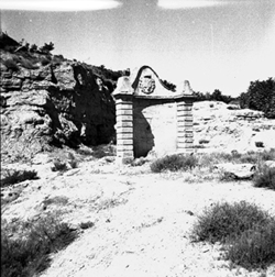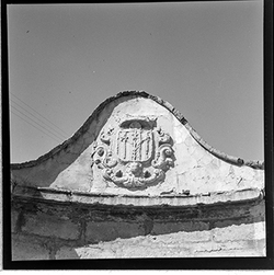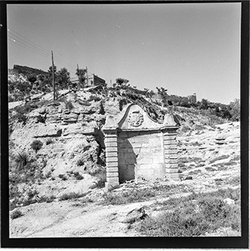 "Font al peu del Turó de Gardeny; detall de l'escut de Lleida a la part superior"