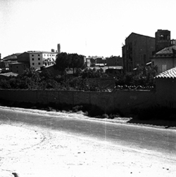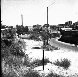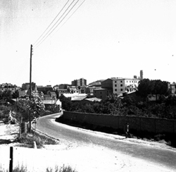 "Final del Carrer Acadèmia, convertit ja en la Carretera Nacional II; al peu del Turó de Gardeny; al fons la Seu Vella"