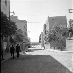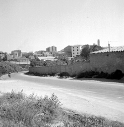 "Voltants dels Blocs Militars, al peu del Turó de Gardeny, entre l'Avinguda de Madrid i el Carrer Isaac Albéniz; al fons el Castell"