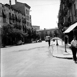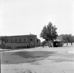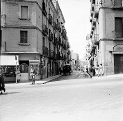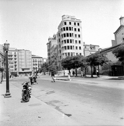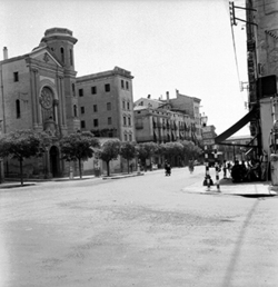"Avinguda de Catalunya, des del xamfrà amb el Carrer Acadèmia; a l'esquerra l'edifici del Col·legi de les Esclavas Inma. Corazón de Maria"