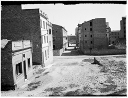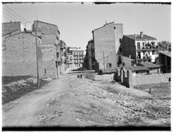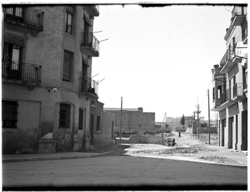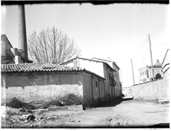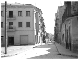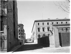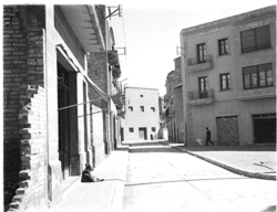 "Part alta del Carrer Ramon y Cajal, amb un estretament ocasionat per la fàbrica d’olis PORCAR; al fons es veu el Santuari de Santa Teresa (Teresina) i la Plaça de les Missions"