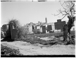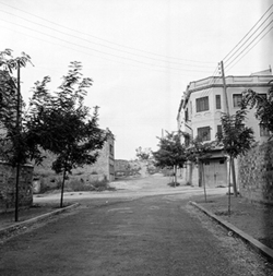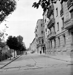 "Carrer Bisbe Messeguer, xamfrà amb la Rambla d’Aragó; al fons es veu l’edifici de la Maternitat; a l’esquerra, la tanca del Seminari\nEs veu part del darrera de les cases Balasch"