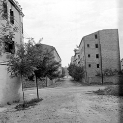 "Pati interior dels Blocs de Ramon y Cajal o Carrer del Mestre Emili Pujol, vist des del Carrer Maragall; uns nens juguen enmig del carrer"