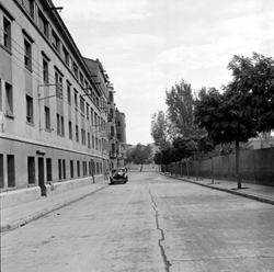 "Carrer Ramon y Cajal; blocs d’habitatges socials, entre els que hi ha el Passatge del Capità Farré i el Carrer Mestre Emili Pujol, al fons"