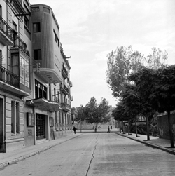 "Carrer Ramon y Cajal, amb la Rambla d’Aragó al fons; a l’esquerra hi ha els blocs d’habitatges socials i l’edifici de l’antic Cine Bahia , més lluny; a la dreta, la tanca del Seminari"