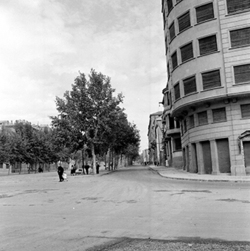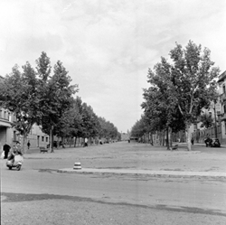 "Part baixa de la Rambla d’Aragó, a tocar l’Avinguda de Catalunya; en primer terme es veu la Creu dels Tres Tombs"