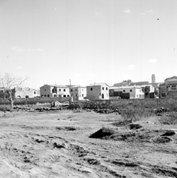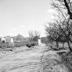 "Grup d’habitatges unifamiliars que en l’època es conegué amb el nom de Grupo 3 de abril ; Passeig de Ronda, des de l’actual Doctor Fleming; al fons es veu el Turó de la Seu Vella"