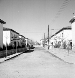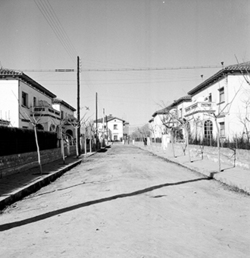 "Grup d’habitatges unifamiliars que en l’època es conegué amb el nom de Grupo 3 de abril ; Carrer de la Independència, des de l'Avinguda de Navarra; al fons es veu el Passeig de Ronda"