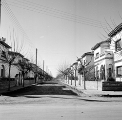 "Grup d’habitatges unifamiliars que en l’època es conegué amb el nom de Grupo 3 de abril ; Avinguda de Navarra; a l’esquerra es veu un cotxe aparcat"