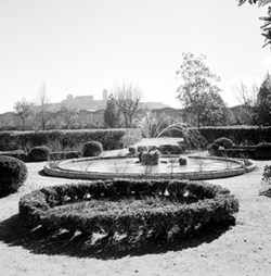 "Jardins de l’Hospital Provincial de Santa Maria; al fons es veu el Turó de la Seu Vella"