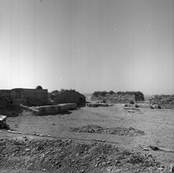 "Vista de l'espai conegut actualment com Plaça de la Sardana, al peu del Baluard de l'Assumpció de les muralles de la Seu Vella; la Porta dels Bernats apareix en obres de neteja per a la seva obertura"