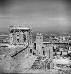 "Vista des del campanar de la Seu Vella, amb el castell de la Suda i les muralles; al fons es veu la ciutat, en la zona nord; sobre la Suda es veu l'antena de Ràdio Lleida (E. A. J. 42 RADIO LERIDA)"