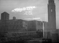 "Vista del conjunt de la Seu Vella des del Baluard del Rei de les muralles de la Seu Vella, amb la façana exterior del claustre i el campanar, sobre el que s’hi ha instal·lat una bastida per a posar una gran creu amb motiu de la SANTA MISION"