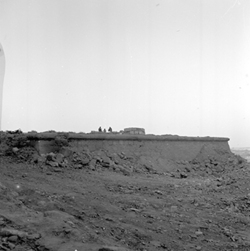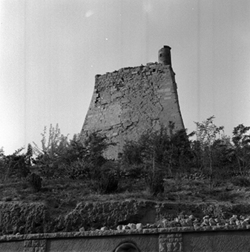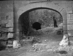 "Vista de la Porta de la Suda, al Baluard del Rei de les muralles de la Seu Vella; un personatge es dirigeix al passadís subterrani"