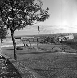 "Vista des del Baluard de la Llengua de Serp de les muralles de la Seu Vella, des de la Plaça de la Sardana, amb els actuals jardins de Pompeu Fabra, en primer terme, i un arbre en primer terme"