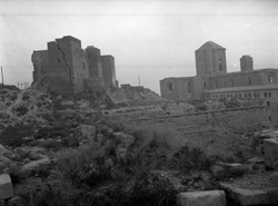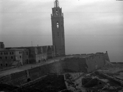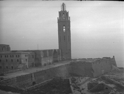 "Vista del castell de la Suda des del Baluard del Rei de les muralles de la Seu Vella, amb vista parcial de la catedral al fons, amb el cimbori"