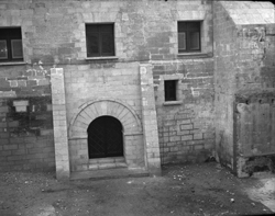 "Vista de detall de la porta principal d'accés a la Casa d'Exercicis de la Seu Vella (Canònica), des del vessant del castell de la Suda"