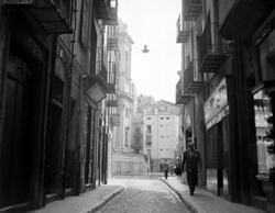 "Zona de Balàfia; zona de l’actual Carrer de les Corts Catalanes, vista des del pont sobre el ferrocarril; al fons es veuen els habitatges unifamiliars, obra de l’arquitecte Casas Lamolla, els quals constitueixen el xamfrà entre els carrers Penedès i Bonifaci III"