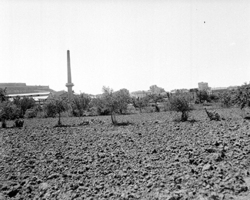 "Zona propera a l’actual Plaça d'Europa i al Passeig de Ronda; al fons es veu el Turó de la Seu Vella; es veu una xemeneia corresponent a l’antiga fàbrica - bòbila Ticó, coneguda de manera informal com La Sulfuro, situada a l’actual Plaça de la Constitució, o Clot de les Granotes"