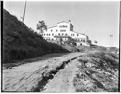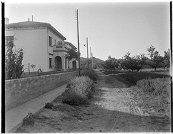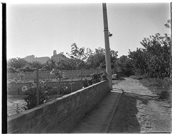 "Vessant del Turó de Gardeny; accés al castell, des de la Carretera Nacional II, actual Passeig de Ronda; al fons edifici de la residència militar"