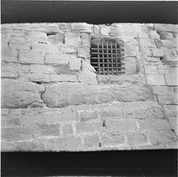 "Vista de detall de les muralles del Turó de la Seu Vella; finestra amb reixa de ferro"