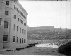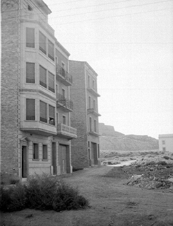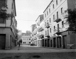 "El Carrer Bonaire, des del xamfrà amb el Carrer Balmes; a l’esquerra es llegeix el rètol DIRECCION GENERAL DE REGIONES DEVASTADAS. ABASTECIMIENTO AGUAS LERIDA. RED DE DISTRIBUCION ; a la dreta es veu parcialment l’edifici de la residència de les Esclavas del Immaculado Corazón de María, o Cordimariana"
