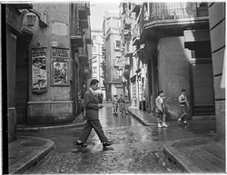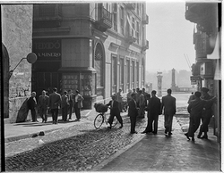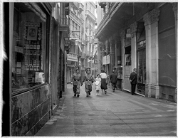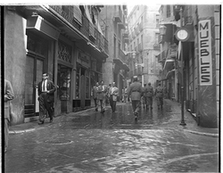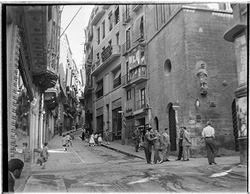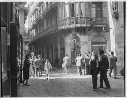 "Xamfrà Carrer Major i Carrer Cavallers; la casa Llorens al fons, amb la botiga OPTICA LUX , i nombrosos vianants vestits de festa"