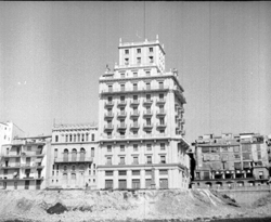 "Plaça de la Pau; al fons l'edifici del Govern Civil en construcció, amb rètol de Regiones Devastadas"