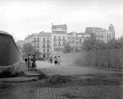 "Des del Carrer Germanetes: a l'esquerra el Carrer Canonge González i a la dreta, el Carrer de la Plateria; al centre un carro amb cavalleries; a l'esquerra es veu la tanca de l'antiga Casa Macià i/o Agapito Lamarca on hi havia hagut la Clínica Montserrat."