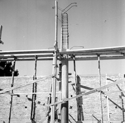 "Eduardo Velasco; construcció dels nous tallers, als carrers de Santa Cecília, Eduardo Velasco i Avinguda d'Alacant; aixecament de murs i pilars de formigó; vista interior"