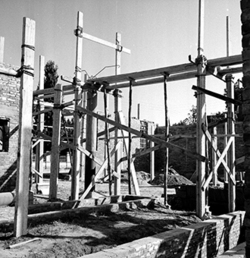 "Eduardo Velasco; construcció dels nous tallers, als carrers de Santa Cecília, Eduardo Velasco i Avinguda d'Alacant; aixecament de murs; vista interior; al fons els Camps Elisis"