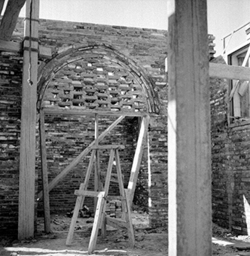 "Eduardo Velasco; construcció dels nous tallers, als carrers de Santa Cecília, Eduardo Velasco i Avinguda d'Alacant; aixecament de murs; porta d’accés a les oficines des del Carrer Eduardo Velasco, amb un obrer"