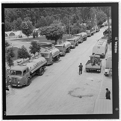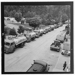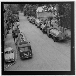 "Vista del carrer de Santa Cecília des del domicili particular del Sr. Terrés. A l’esquerra hi ha els arbres dels Camps Elisis, i al costat s’hi veuen diversos camions de distribució de petrolis de CAMPSA, del concessionari Eduardo Velasco"