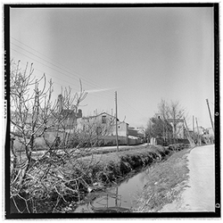 "Sèquia de Torres pel Barri de Cappont, zona corresponent a l’actual Avinguda Jaume II i Plaça Blas Infante i Avinguda de València. El Turó de la Seu Vella al fons"