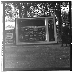 "Vista d’un espai de la Fira de Sant Miquel on es troba l’estand ROGER, dedicat a la venda i exposició d’electrodomèstics. S’observen diversos elements propis de la fira i l’activitat comercial del recinte."