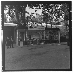 "Estand de \"OLIVETTI\" , màquines d'escriure i material d'oficina, i de \"CASA FREGOLA\", llibreria, a la Fira de Sant Miquel"