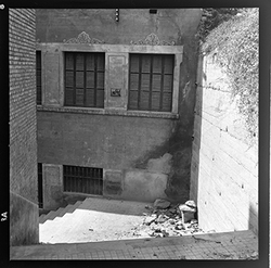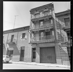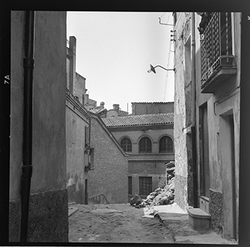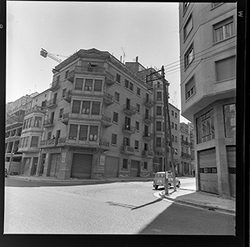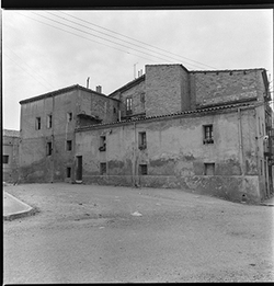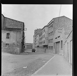 "Vista de la Ronda de Sant Martí; a l’esquerra hi ha el xamfrà amb el Carrer del Rei; a la dreta, els blocs de la Diputació de Lleida; al fons, s’intueix la Presó de Lleida"