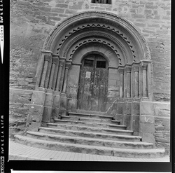 "Detall de la portada romànica de l'església de Sant Martí, procedent de l'ermita del Tormillo, a Osca (Huesca)"