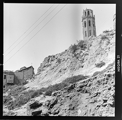 "Vista de la part alta del Turó de la Seu Vella, amb el campanar al fons; en primer terme, hi ha les ruïnes dels antics edificis de la part alta del Canyeret"