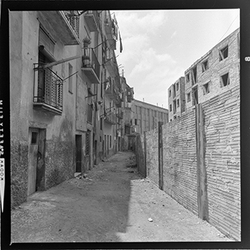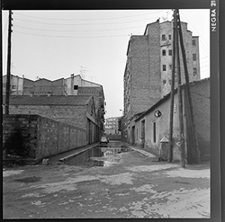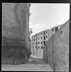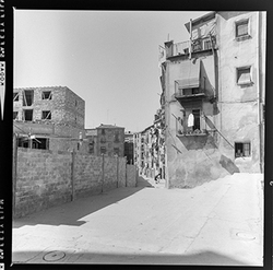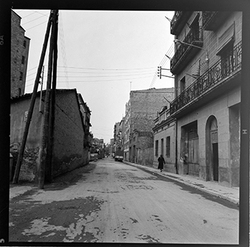 "Vista del Carrer del Joglar Segalà; a l'esquerra es veuen els nous blocs de la Plaça de Sant Antoni Maria Claret en construcció a l'espai on hi havia l’antic Convent de l'Ensenyança"