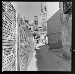 "Vista del Carrer del Joglar Segalà; a la dreta es veu el començament del Carrer Alçamora; a l'esquerra hi ha la tàpia que tanca l'espai on hi havia l’antic Convent de l'Ensenyança; al fons es veu la Plaça de l'Ereta"